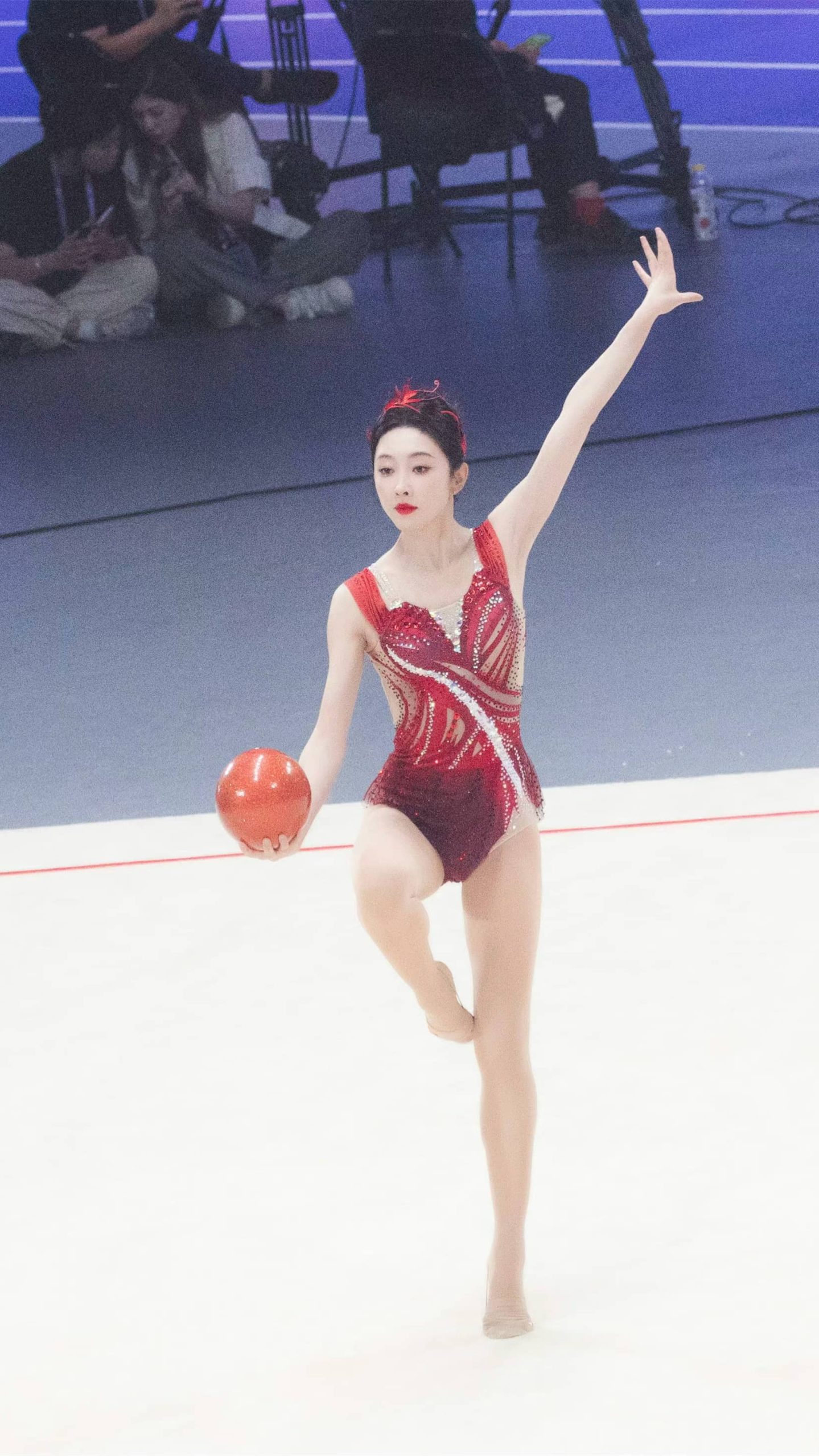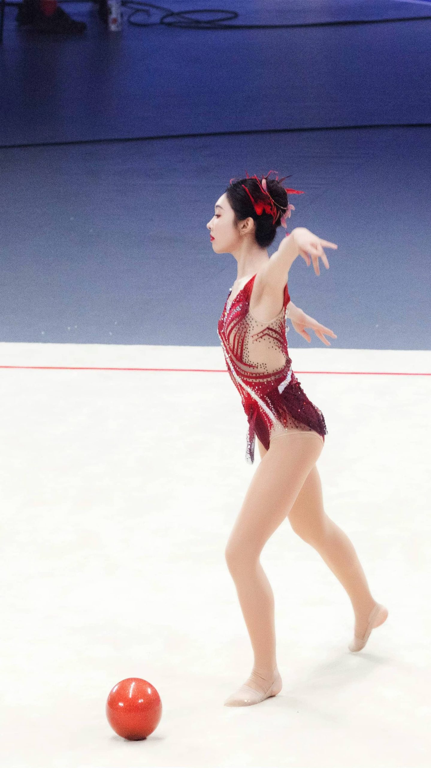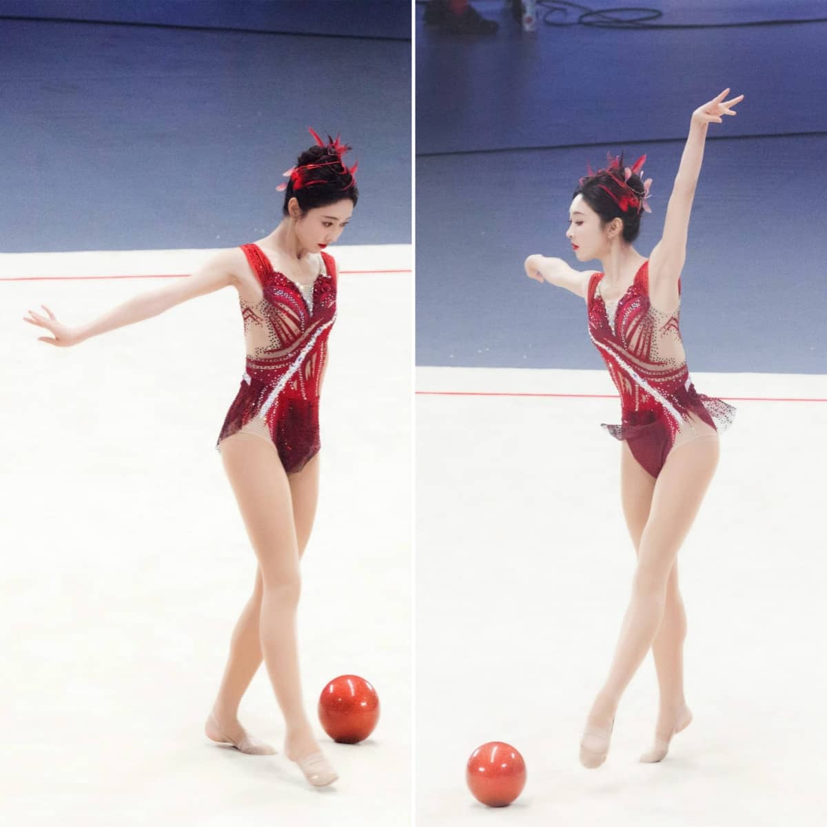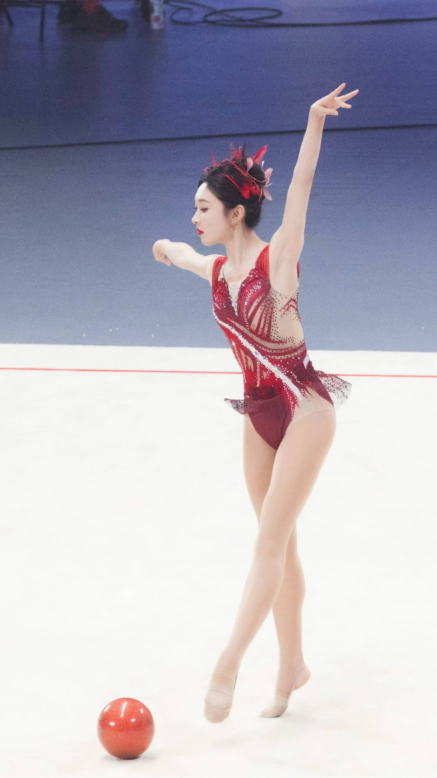 宣璐艺术体操妆造,玫红服饰,体态纤美多姿