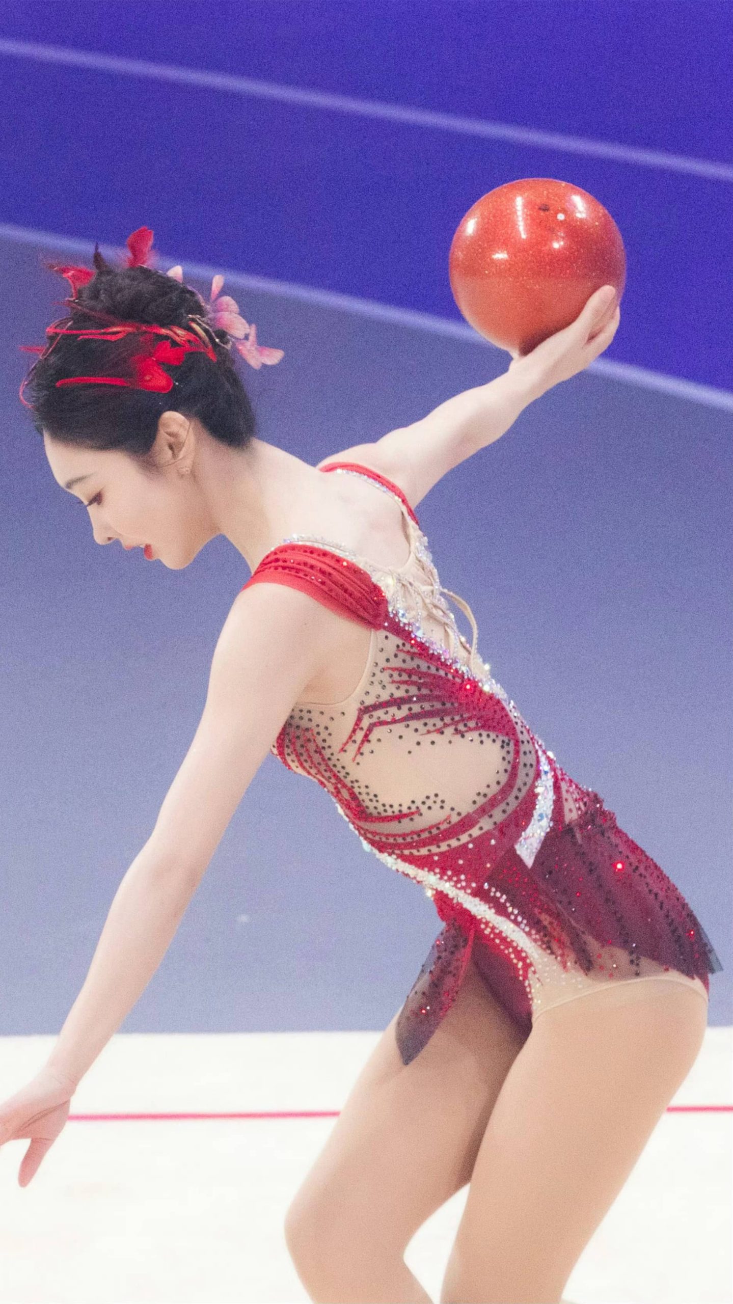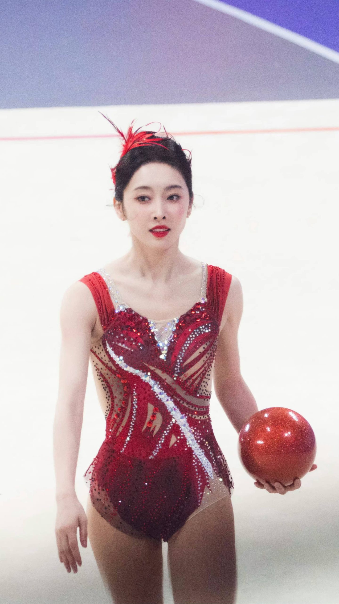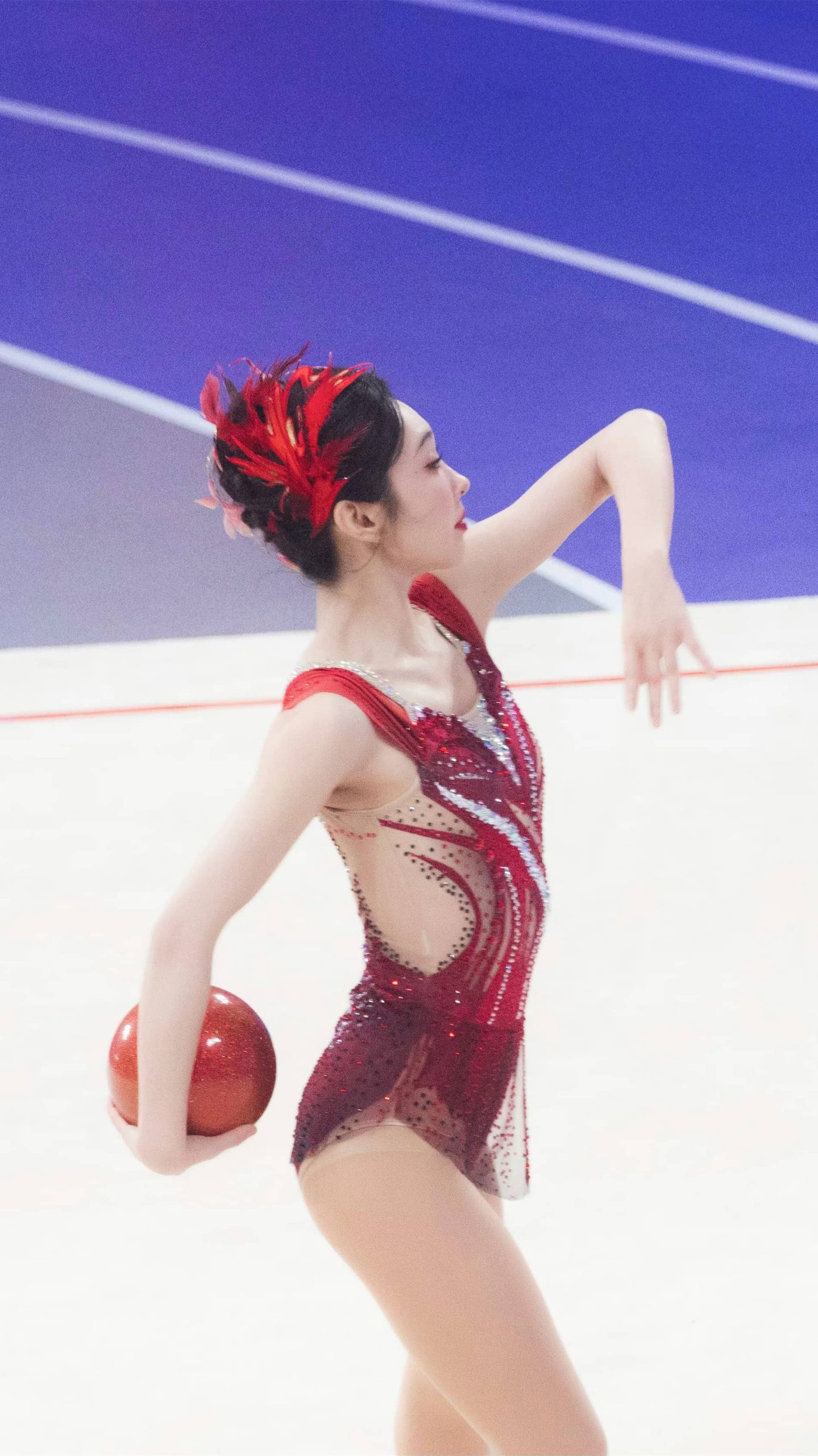 宣璐艺术体操妆造,玫红服饰,体态纤美多姿