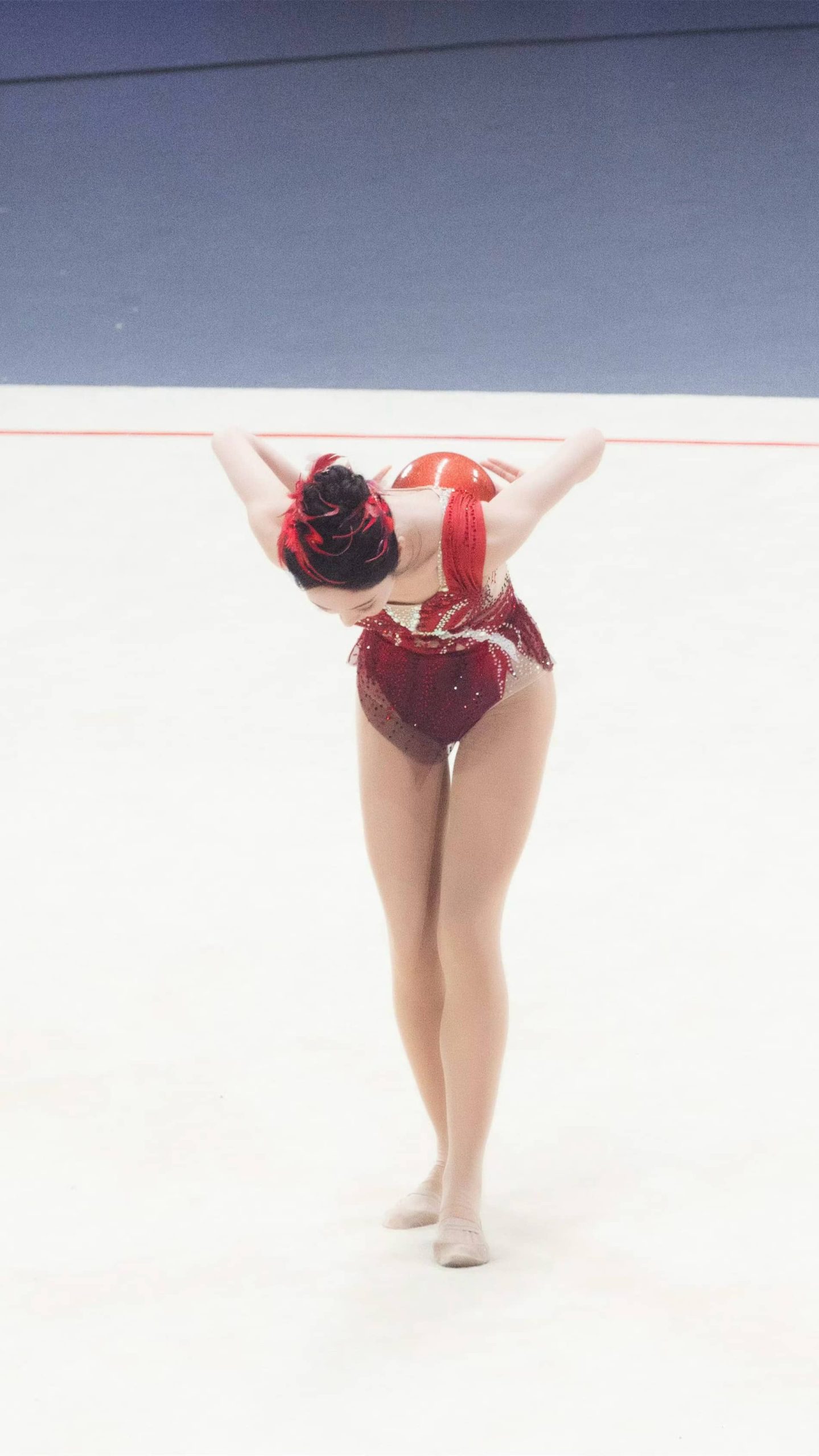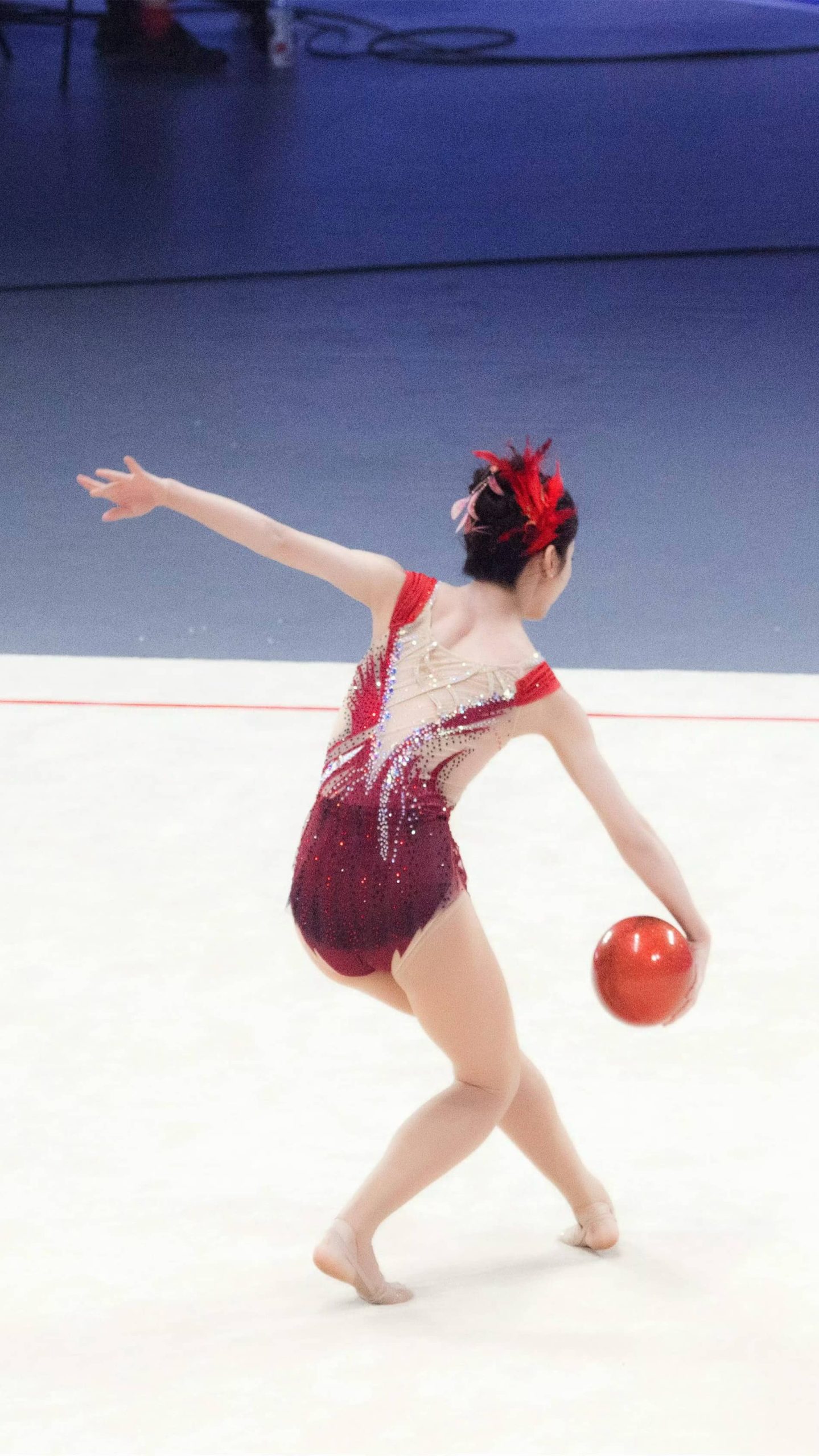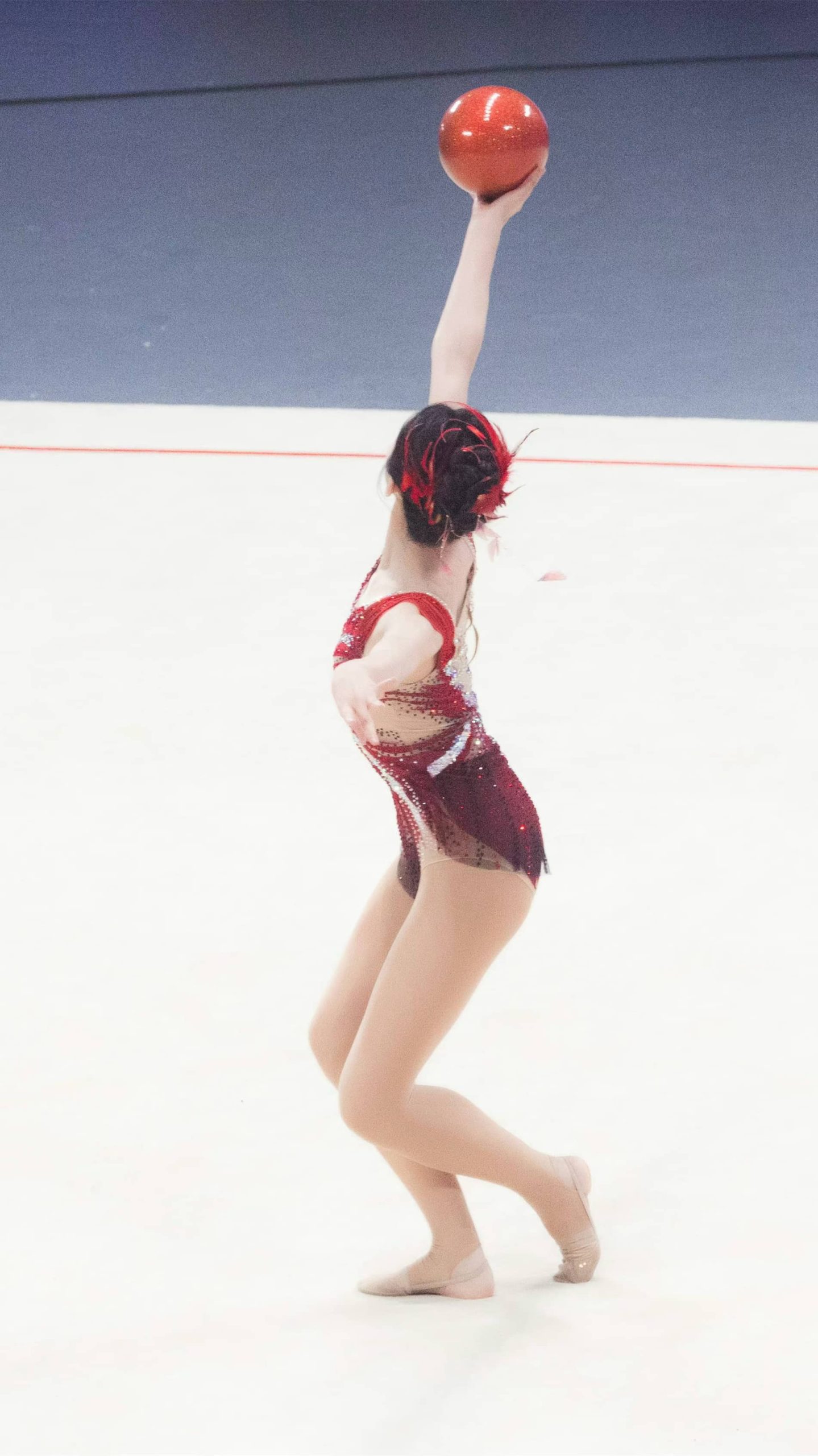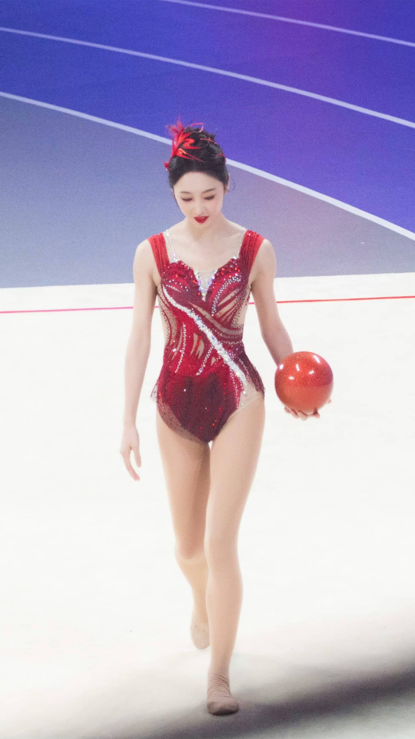 宣璐艺术体操妆造,玫红服饰,体态纤美多姿